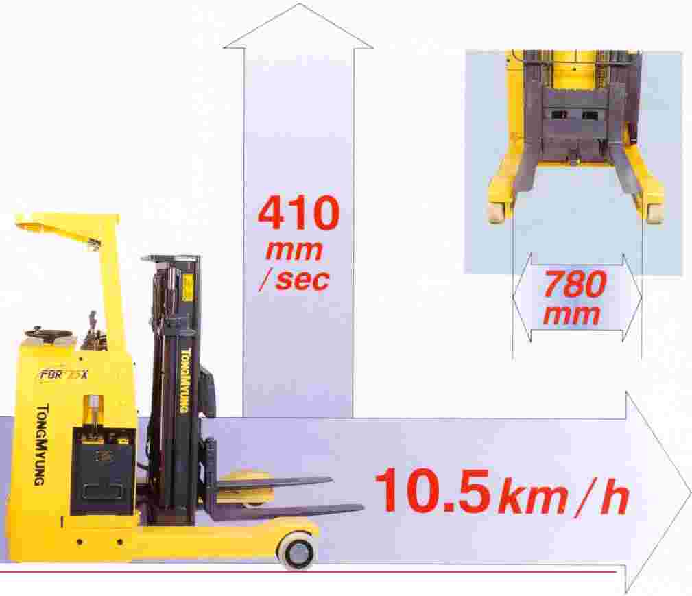 Mast and chassis are designed with wide type as a basic structure and its maximum fork spreading width reachs to 780mm which is the best fork spreading width in same grade, and it meets the requirement for handling of wide pallets. It performs at maximum traveling speed 10.5 km/h by adopting the big capacity traveling motor of 4.4kw, regarded as a top traveling speed in same grade. Furthurmore, large capacity gear pump of 19.5 cc/rev and the hydraulic motor of 8.5kw enable it to perform at the lifting speed of 410 mm/sec and realise an outstanding working performance. |