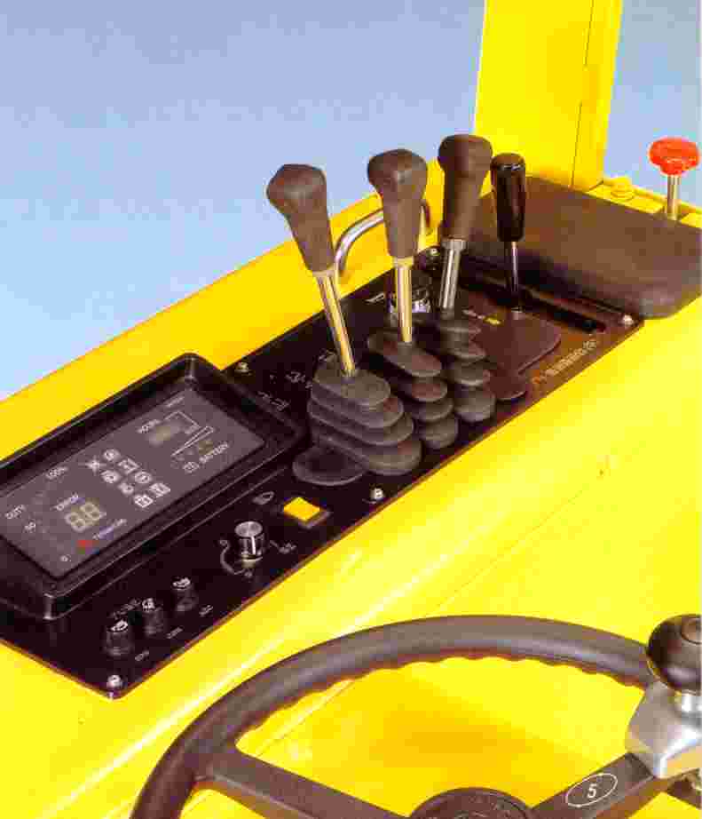 The plastic product having beautiful appearance is adopted for the panel, and the configuration is soft and deluxe because its base is tinged with black colour, numerals and figures with silver colour. This enables it to display clearly the status of operation. Various kind if cushions such as body cushion under body, leg cushion under knee, arm cushion under elbow, floor cushion under feet and pedal cushion under brake pedal are equipped in accordance with each of human body portion contacted during operation so that operator can be comfortable. Lifting lever, reach lever and tilt lever are arranged at the most convenient position for easy operation, in addition to it, hand grip is equipped for the easy operation of accelerator during the long time travelling. Also in consideration of operator;s view, panel is arranged for operator to catch a sight on the panel at a glance. It makes operator be more comfortable in his operation. To prevent the part of the top hood from dust and moisture, the holes on the hood are filled up. Chassis frame which is designed by computer with the latest round design technique looks powerful and smart. |